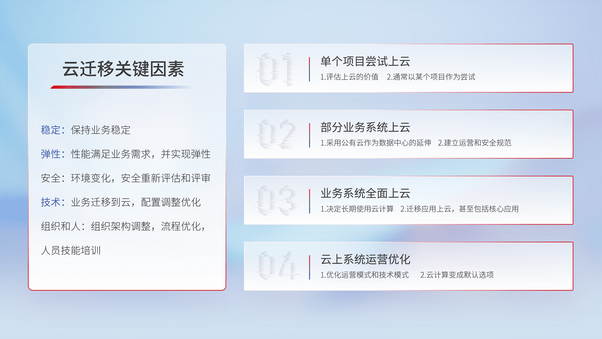 结合实际业务,,,从规划设计、、云平台选型、、、云原生改造、、、、数据迁移、、集成交付,,迁移全过程为客户识别最佳上云路径,,做好风险识别管理,,,设计网络架构、、、、身份权限、、、、安全审计合规、、、操作审计、、、、日志审计、、、监控告警策略、、、多站点容灾设计等,,,对云上基础设施进行整体规划,,,提升IT治理水平,,,以满足弹性、、高可用、、高性能的需求。。。。